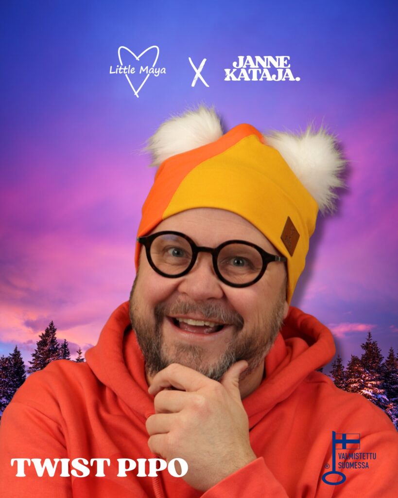 Janne Katajan Little Mayalle suunnittelema Twist pipo. Pipossa on väreinä pirteät okra ja oranssi ja siinä on kaksi tekoturkistupsua. Pipon vuori on ohutta mutta lämmintä merinovillaa ja siinä on korvien kohdalla lisäksi tuulensuojakankaat takaamassa, että tarkenet sen kanssa kylmemmilläkin ilmoilla.